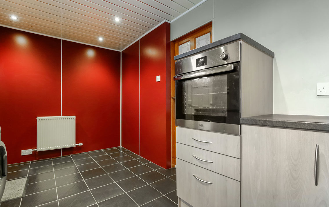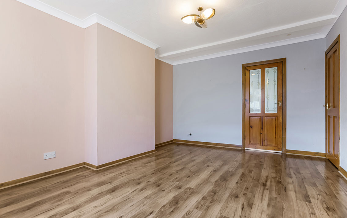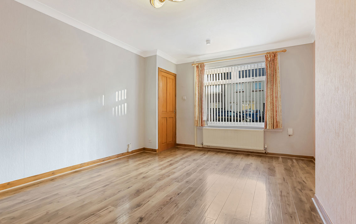 The living room is to the front with space for freestanding furniture and a walk-in, under-stair cupboard with shelving, fuse box and meter.