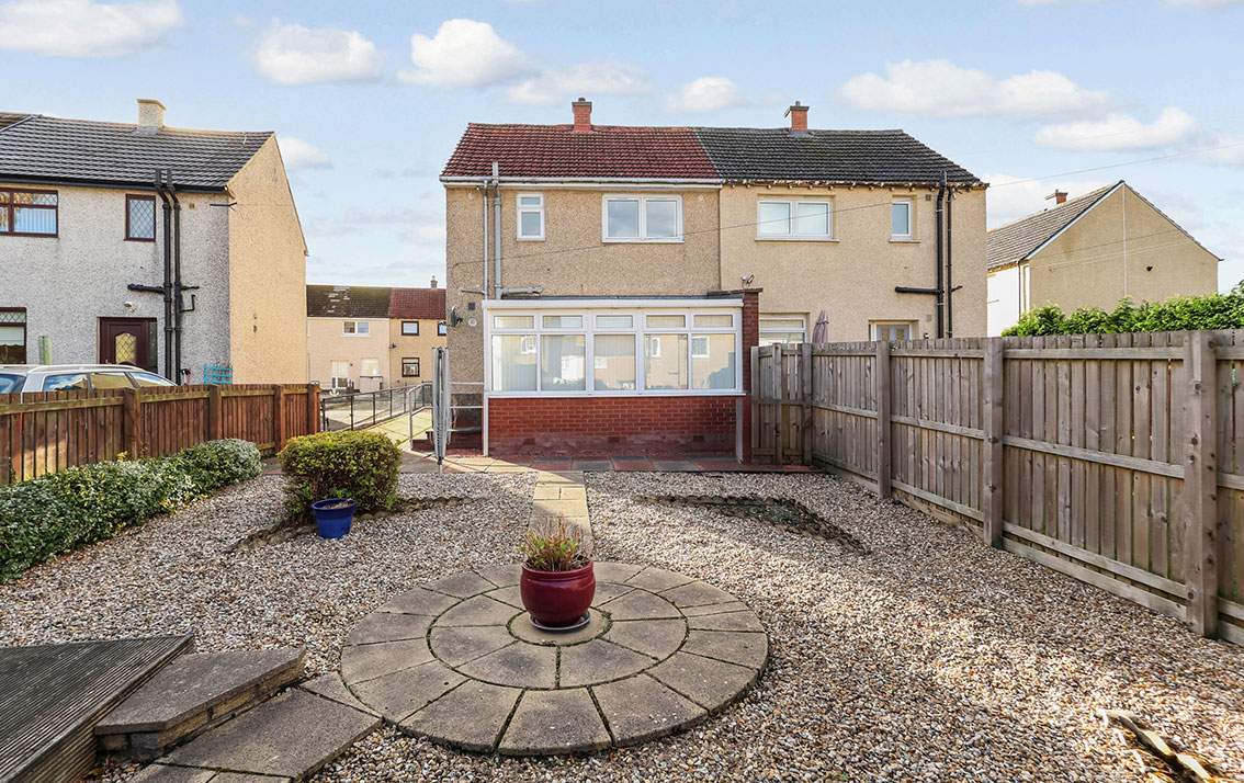 The garden to the front is pebbled and bounded by a chain fence. The rear garden is paved with pebbled areas, a deck and a garden shed. There is shrub planting to the side and flower borders to the rear.