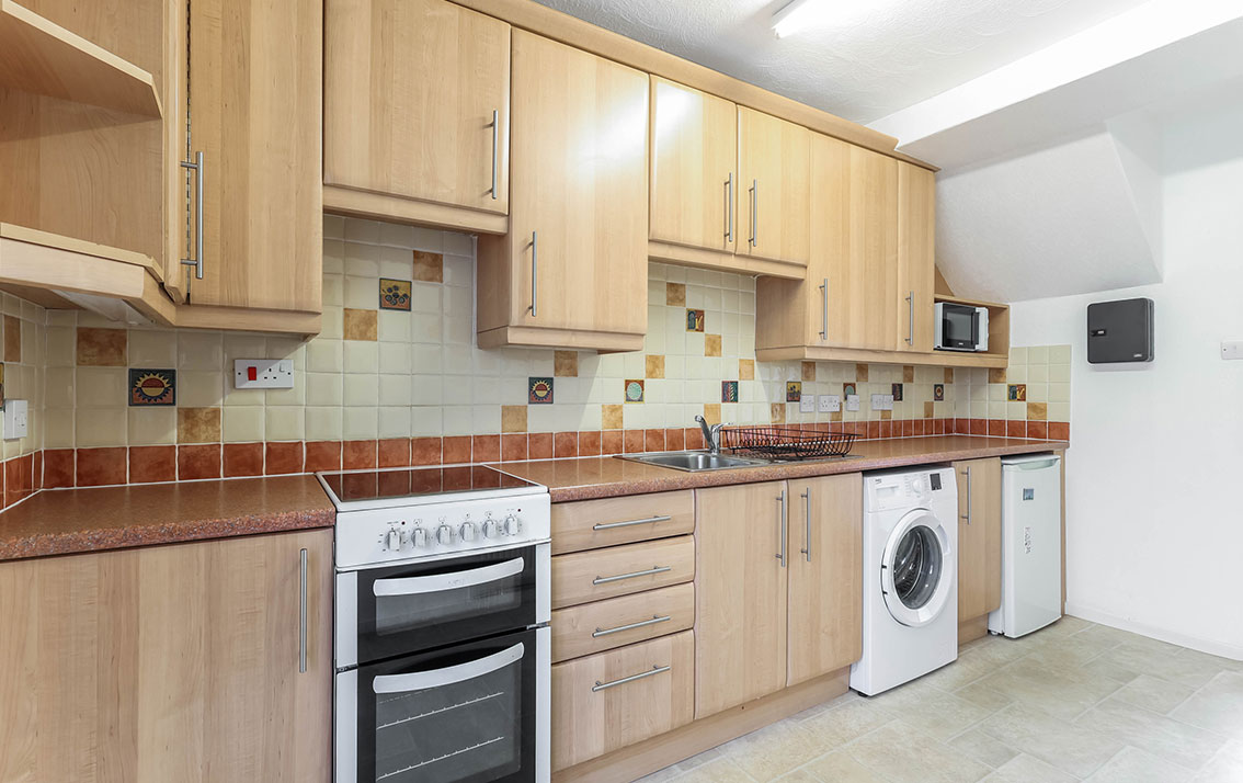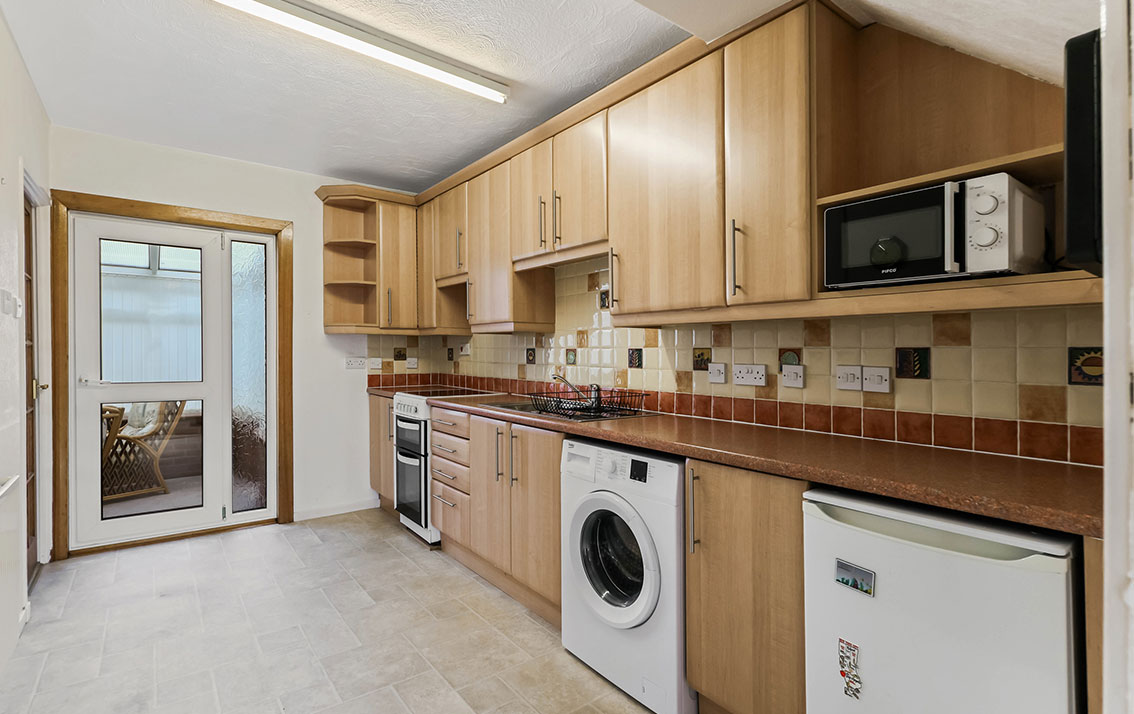 The kitchen is fitted with a range of wall and base units with stainless steel sink and drainer, coordinating worksurfaces and tiling to splashback. The ceramic top cooker, fridge and washing machine are included in the sale but are not warranted. A door to the rear leads to the garden. Further door to hall.