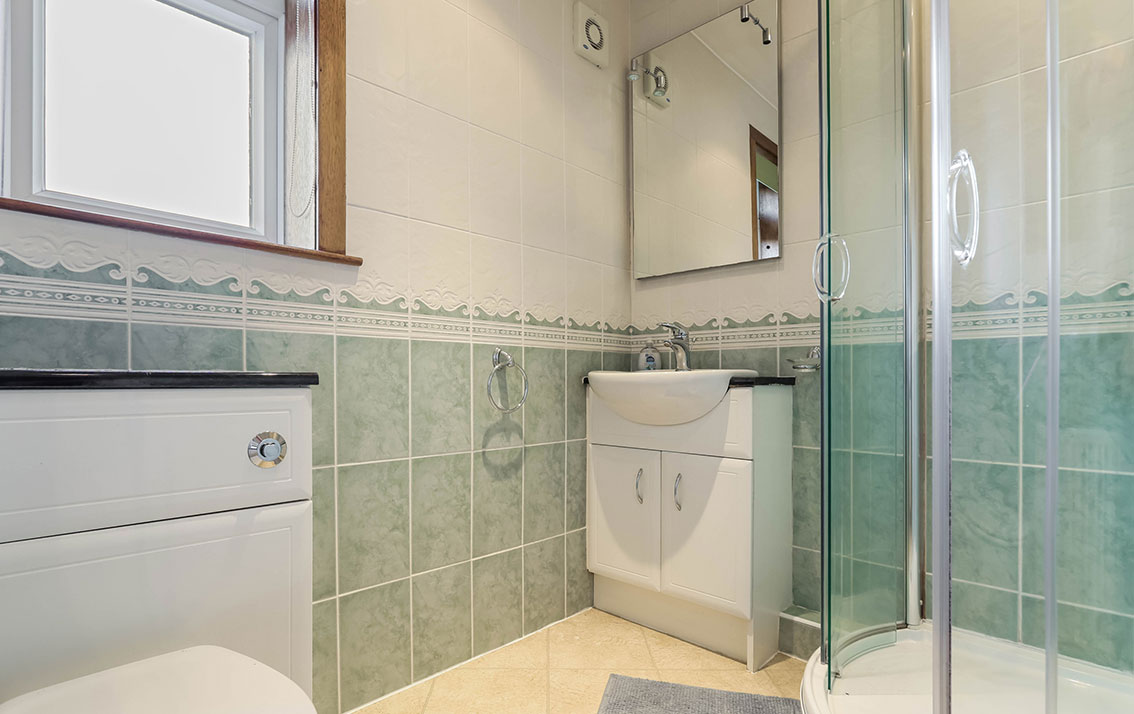 The fully tiled shower room completes the accommodation and is fitted with a a white suite comprising wash hand basin with vanity storage, a WC and a corner shower cubicle with Mira Sport shower. Window to rear.