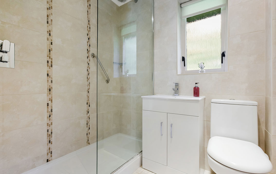 The fully tiled shower room benefits from underfloor heating and is fitted with a white suite with a wash stand, WC and a separate double tray shower with glass screen. Window to rear.
