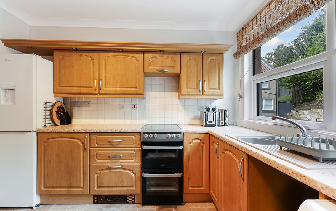 The breakfasting kitchen, with wall-mounted fold-down table, is fitted with a range of wall and base units incorporating a sink and drainer with co-ordinating worksurfaces and tiling to splashback. The ceramic top cooker, washing machine and fridge/freezer are included in the sale but are not warranted. Twin windows to the front offer views to the courtyard.