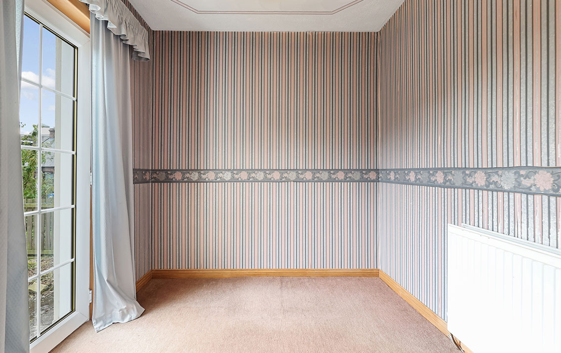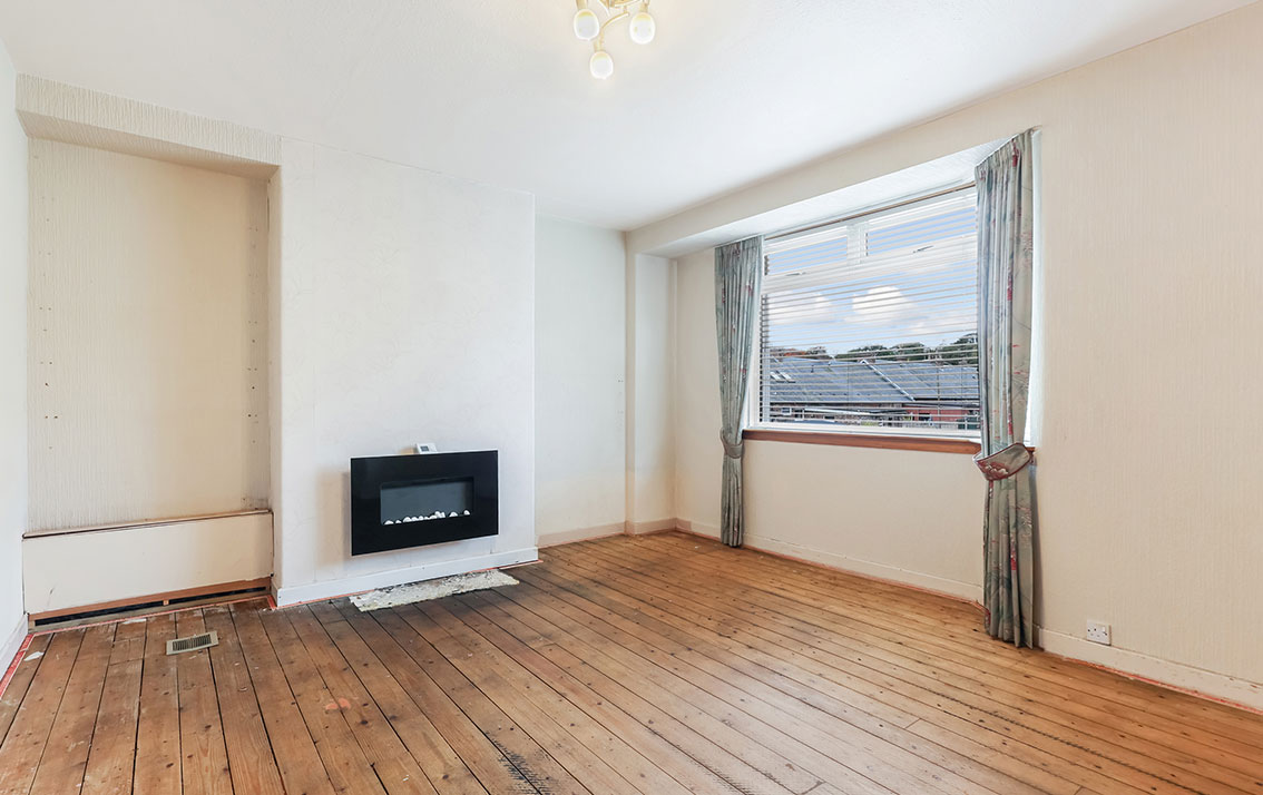 The well-proportioned living room is to the front with space for freestanding furniture and a wallmounted modern electric fire which is included in the sale. The window overlooks the front garden.
