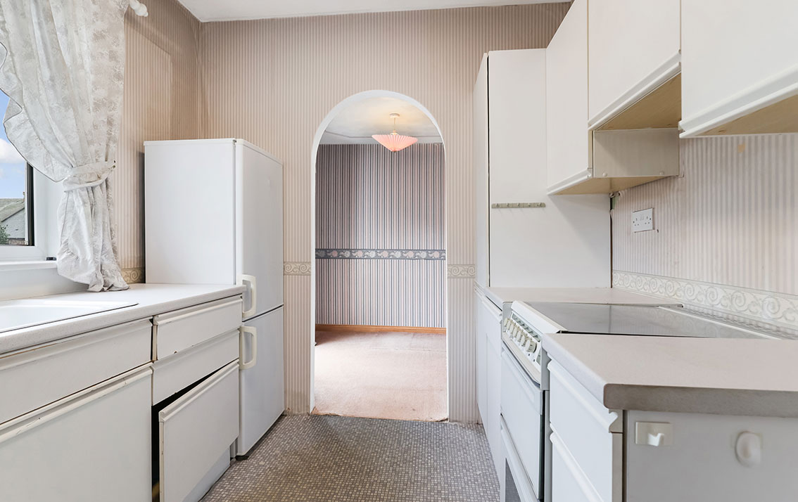 The kitchen is fitted with wall and base units with enamel sink and drainer and co-ordinating worksurfaces. The dual fuel cooker, fridge/freezer and the washing machine are included in the sale but are not warranted. A window overlooks the rear garden. Situated off the kitchen is a dining area which offers flexible space and has a door to the garden.