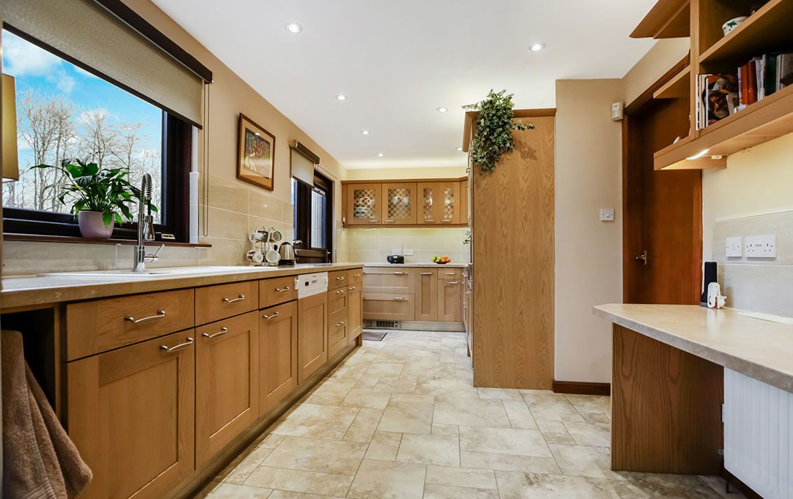 The kitchen has views to the rear garden and is fitted with a range of wall and base units with complementary worksurfaces, 1.5 composite sink and tiling to splashback. The gas hob, extractor hood, oven, fridge, freezer, dishwasher and and micro oven are included in the sale but are not warranted. A door at the rear leads to the garden.