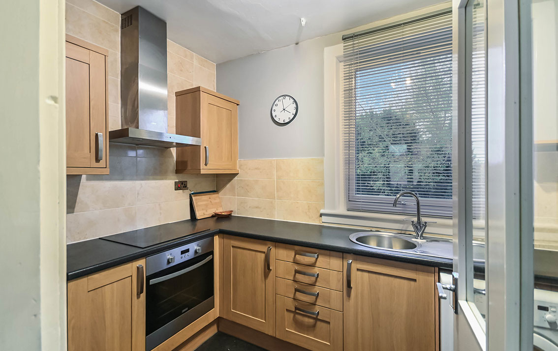 The bright living room is to the front and has ample space for freestanding furniture and a cupboard. A door to the rear leads to the kitchen which is fitted with a range of modern wall and base units with sink and drainer, complementary worktops and tiling to splashback. The electric hob, oven, extractor hood and the washing machine are included in the sale but are not warranted.